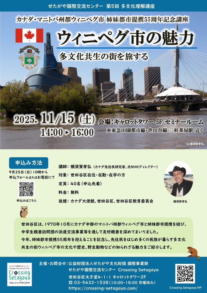 世田谷区は、1970年10月にカナダ中部のマニトバ州都ウィニペグ市と姉妹都市提携を結び、中学生親善訪問団の派遣交流事業等を通して友好親善を深めてまいりました。今年、姉妹都市提携55周年を迎えることを記念し、先住民族をはじめ多くの民族が暮らす多文化共生の街ウィニペグ市の知られざる魅力をご紹介します。