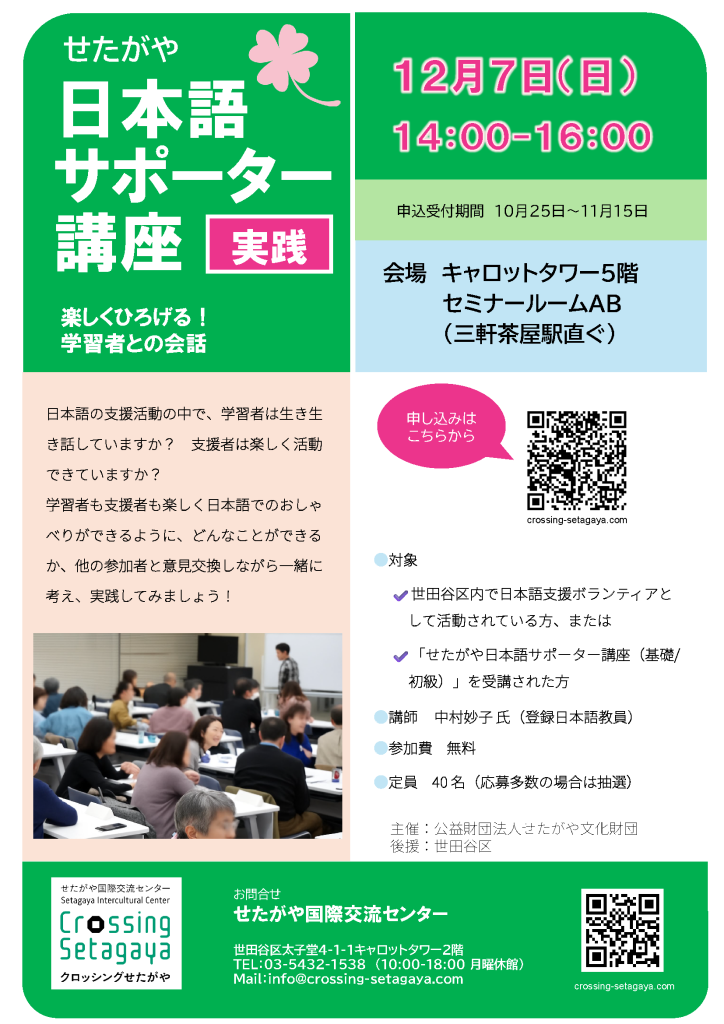 現在、世田谷区内の日本語教室でボランティア活動をされている方(以前、ボランティア活動をされていた方)、または