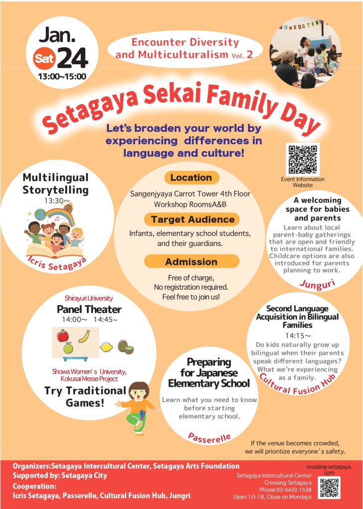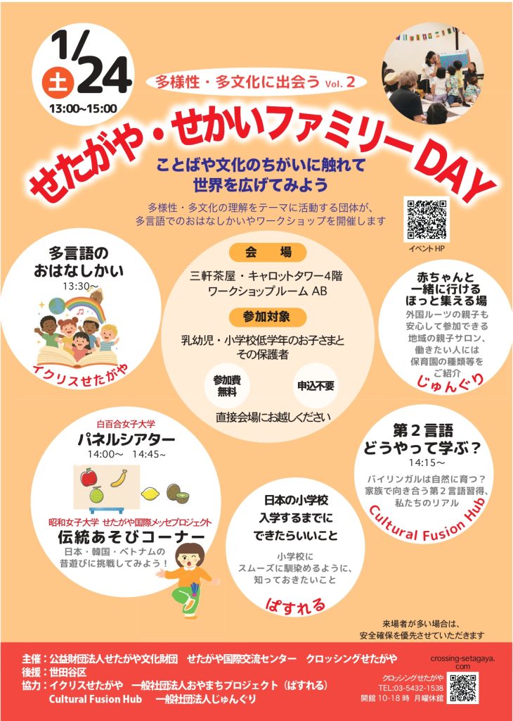 多文化や多様性の理解をテーマに活動する子育て関連の団体が集まり、「多言語でのお話し会」「第二言語の学び」「保育園入園」「公立小学校入学」についてとワークショップなど、それぞれの経験や活動をもとに出展します。いろいろな言葉や文化にふれたい方、日本の保育・教育システムについて知りたい方など、お気軽にご参加ください。