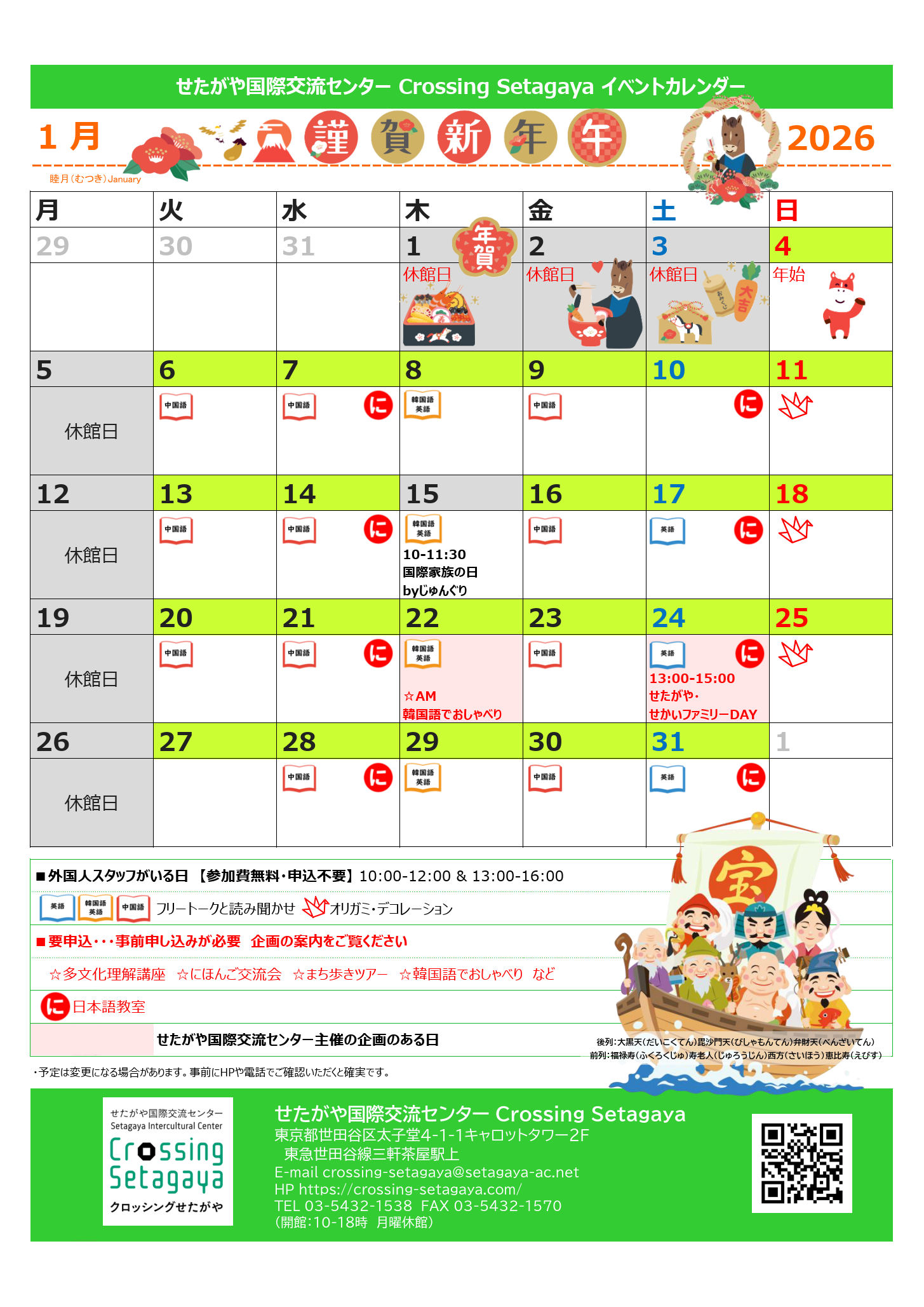 2026年1月のイベントカレンダー Posted on 2025.12.28 2025年は、たくさんのイベントを通して、多くの皆様と多文化共生・多様性を感じられる、笑顔あふれる一年となりました。 新年は、1月4日より通常通り開館いたします。※1月5日は休館日です。 2026年も、さらに楽しく、心に残るイベントをお届けできるよう、せたがや国際交流センター職員一同、力を合わせて取り組んでまいります。本年もどうぞよろしくお願いいたします。